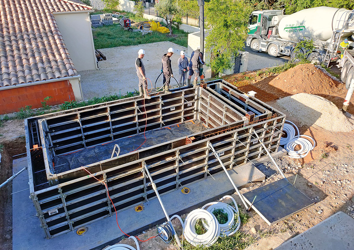 « Hormis le calendrier très court pour livrer le projet, le chantier n’a pas présenté de difficultés particulières ; le terrain était facile d’accès et sur place, nous n’avons pas rencontré de problème notoire. Heureusement, notre expérience reste un formidable atout et elle nous permet de répondre efficacement à toutes les problématiques, quelles qu’elles soient. Le vrai challenge, ici, c’était la configuration de ce modèle, un coup d’essai pour Scanzi Piscines. Nous avons tout paramétré et tout évalué en amont et, pour gagner du temps, nous avons même commandé la vitre. Si les différentes étapes du projet ont été classiques (préparation et réalisation du terrassement, structure, etc.), il fallait que le travail de maçonnerie soit absolument parfait pour accueillir cette vitre de 6 m de long sur 0,65 m de haut. Il nous a fallu créer ce que j’appelle la feuillure, c’est-à-dire une fente dans le béton, de 15 cm de profondeur sur tout le linéaire horizontal et sur les remontées verticales, pour y glisser cette vitre monumentale. Nous n’avions droit qu’à un jeu d’un demi-centimètre maximum. Autant dire pas le droit à l’erreur. »