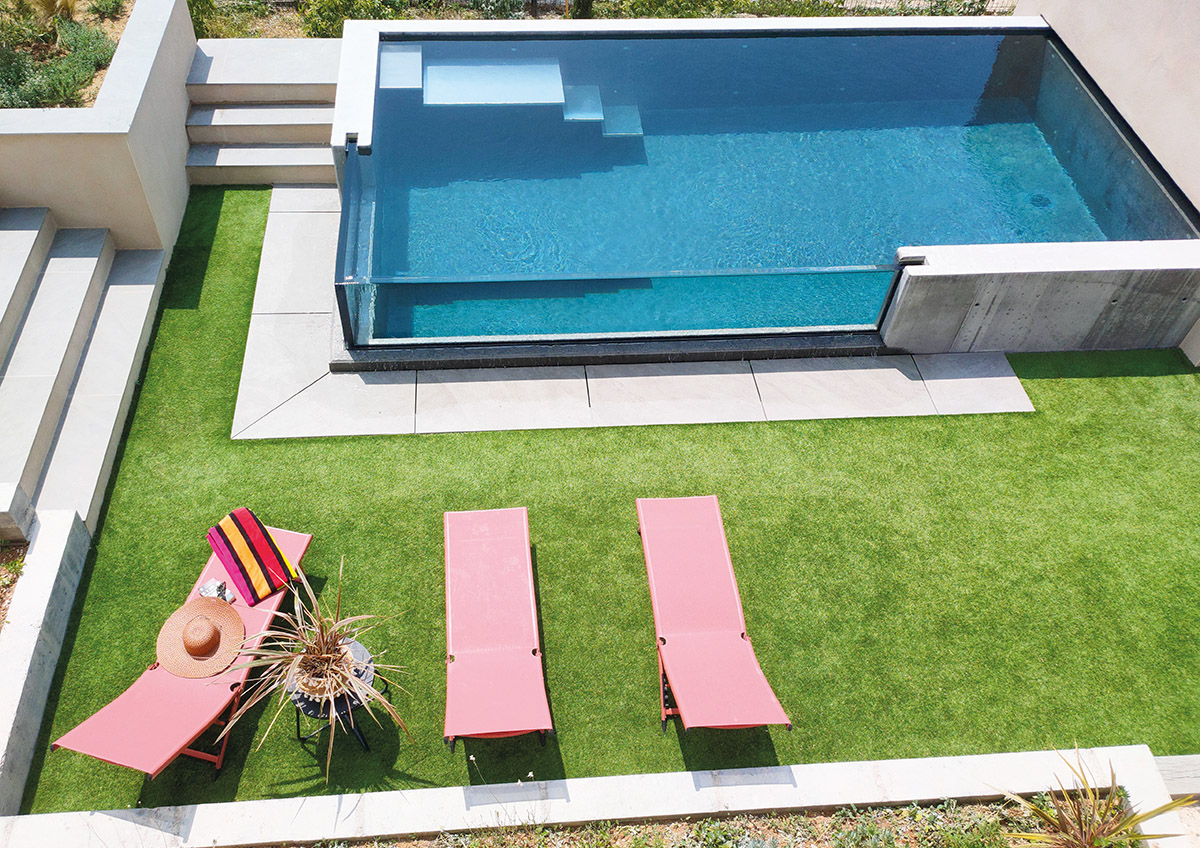 Dimensions : bassin à débordement de 7 m x 3 m intégrant une paroi vitrée d’angle en PMMA (Vision d’O) de 4 m x 1,65 m x 0,75 m, et des marches escalier suspendu en inox