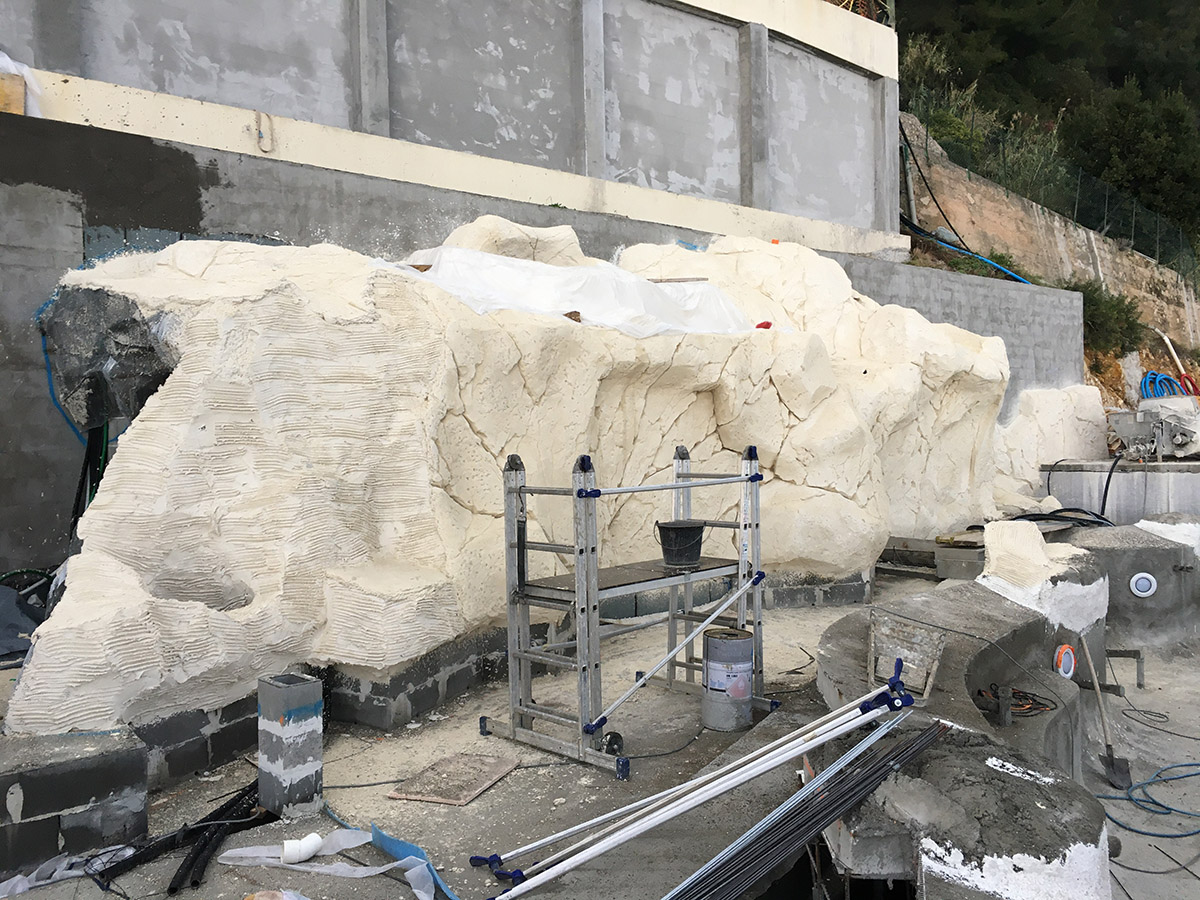 « Notre force réside dans les quelque 1100 piscines que nous réalisons chaque année. Tout cela reste possible grâce à notre expertise globale et aux différents corps de métier présents dans l’entreprise. Lorsque notre bureau d’étude technique et hydraulique ainsi que notre spécialiste rochers ont terminé leur partie du projet, le conducteur de travaux peut commencer le chantier. Il le suivra du premier traçage jusqu’à la mise en service du bassin. Sous ses ordres, sont intervenus successivement différents compagnons : 2 ferrailleurs squelette, un plombier hydraulique, 5 personnes pour la projection du béton et les 2 chauffeurs des camions, 2 sculpteurs de rochers, 2 maçons pour les finitions décoratives, une équipe de 5 personnes pour le revêtement en marbre de Carrare et un technicien pour la mise en service. Je me dois de préciser que notre maîtrise de la projection béton nous a permis de « contourner » le problème de l’accessibilité au terrain. Elle a représenté un gain de temps appréciable pour ce chantier que nous avons livré en 12 semaines. Autre spécificité de ce projet : le local technique qui se cache dans les faux rochers. Une astuce qui nous permet de n’offrir au regard qu’un paysage paradisiaque qui, en plus, semble tout à fait naturel. »
