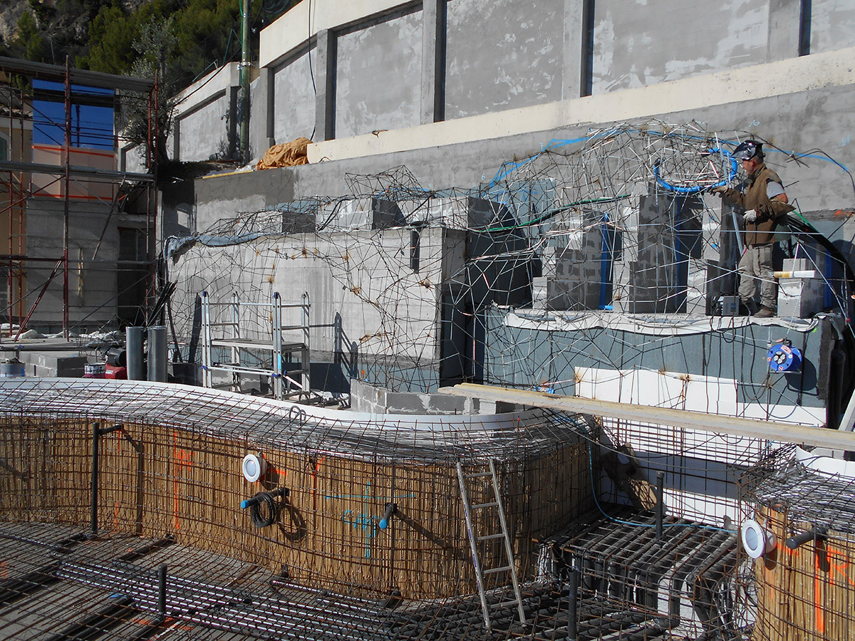 « La situation géographique de la propriété appelée à accueillir l’espace piscine a obligé les équipes de Diffazur Piscines à faire preuve d’ingéniosité et d’adaptabilité. Le terrain, à flanc de falaise, offre un accès limité, avec des chemins étroits et le bassin devait prendre place sur le toit d’un garage. Autant de points sensibles à gérer en amont. Chez Diffazur Piscines, nous sommes en mesure de réaliser chaque projet entièrement grâce à nos équipes dédiées. Mais dans ce cas précis, nous avons obtenu les informations concernant l’ouvrage existant d’un bureau technique extérieur pour nous permettre d’avaliser la faisabilité de cet espace piscine. Le bassin en eau, à lui seul, pèse environ 170 tonnes et les ouvrages périphériques, environ 150 tonnes. Il s’agit là des poids théoriques calculés. Nous avons pour principe de ne réaliser le projet que si la construction déjà existante, en l’occurrence le garage, est apte à supporter le double du poids annoncé, soit plus de 640 tonnes. Il en va de notre responsabilité, tant pour les équipes de Diffazur Piscines, qui doivent travailler dans des conditions maximales de sécurité, que pour notre client. Notre garantie décennale nous engage.