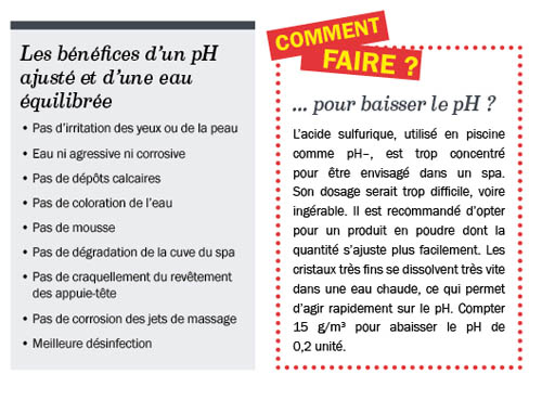Le pH (potentiel hydrogène) de l’eau conditionne l’efficacité du procédé de désinfection : plus il est élevé, moins le chlore ou le brome sera actif. Or dans le cas d’un spa, la tendance de cette variable est clairement à la hausse à cause des phénomènes d’évaporation et de libération de gaz carbonique. Même si le brome supporte un pH relativement élevé (7,6) et que les utilisateurs ne sont que très peu susceptibles d’immerger leur tête, un pH élevé demeure problématique pour les équipements comme pour les utilisateurs. D’où l’importance, comme en piscine, de veiller au bon équilibre de l’eau et à l’ajustement du pH à un niveau optimal à 7,4 ou 7,6 (pour le brome). Le traitement comme la consommation de produits seront optimisés et le confort sera amélioré. Résultat d’une eau bien gérée ? Une satisfaction client assurée !