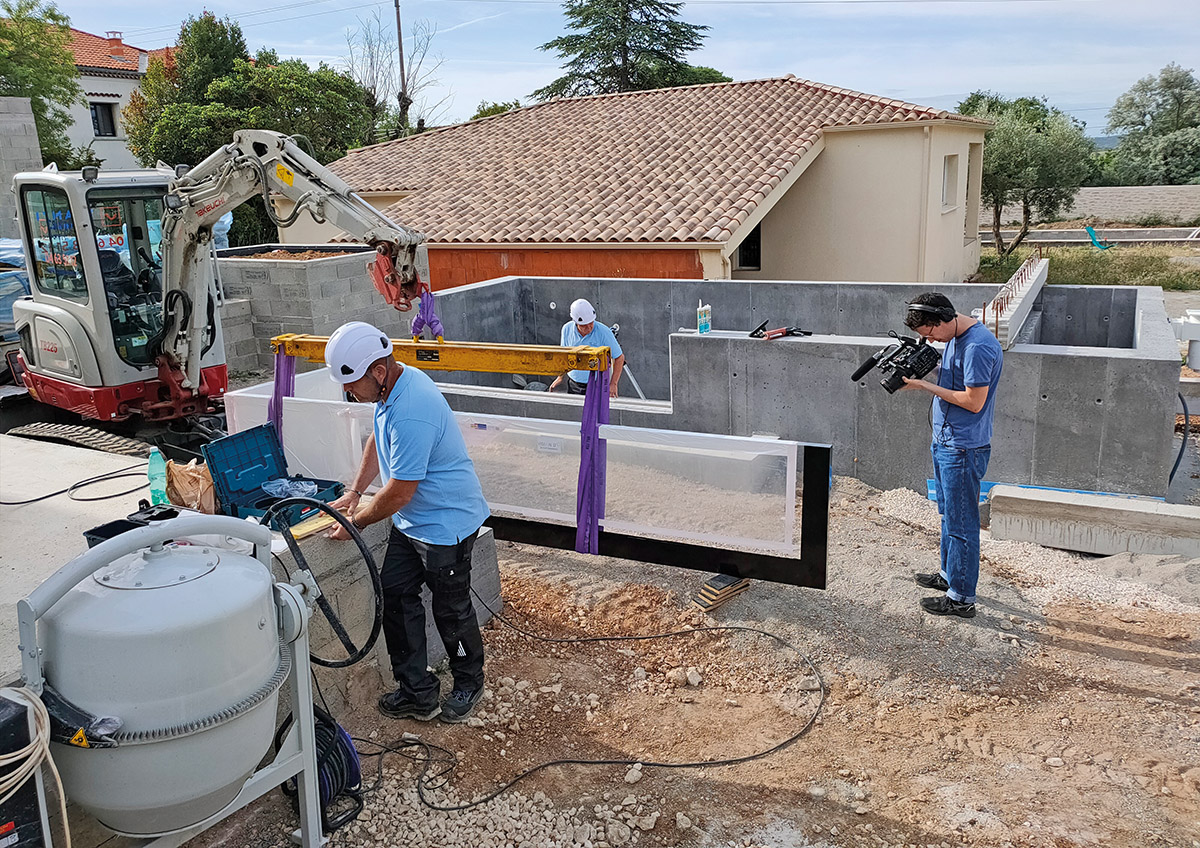 « Hormis le calendrier très court pour livrer le projet, le chantier n’a pas présenté de difficultés particulières ; le terrain était facile d’accès et sur place, nous n’avons pas rencontré de problème notoire. Heureusement, notre expérience reste un formidable atout et elle nous permet de répondre efficacement à toutes les problématiques, quelles qu’elles soient. Le vrai challenge, ici, c’était la configuration de ce modèle, un coup d’essai pour Scanzi Piscines. Nous avons tout paramétré et tout évalué en amont et, pour gagner du temps, nous avons même commandé la vitre. Si les différentes étapes du projet ont été classiques (préparation et réalisation du terrassement, structure, etc.), il fallait que le travail de maçonnerie soit absolument parfait pour accueillir cette vitre de 6 m de long sur 0,65 m de haut. Il nous a fallu créer ce que j’appelle la feuillure, c’est-à-dire une fente dans le béton, de 15 cm de profondeur sur tout le linéaire horizontal et sur les remontées verticales, pour y glisser cette vitre monumentale. Nous n’avions droit qu’à un jeu d’un demi-centimètre maximum. Autant dire pas le droit à l’erreur. »
