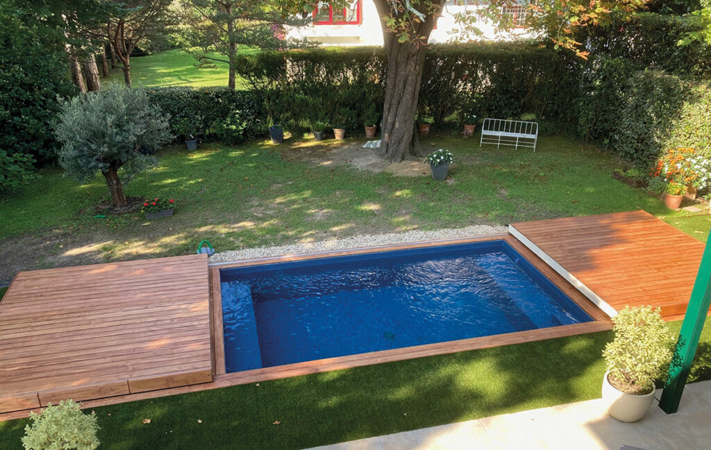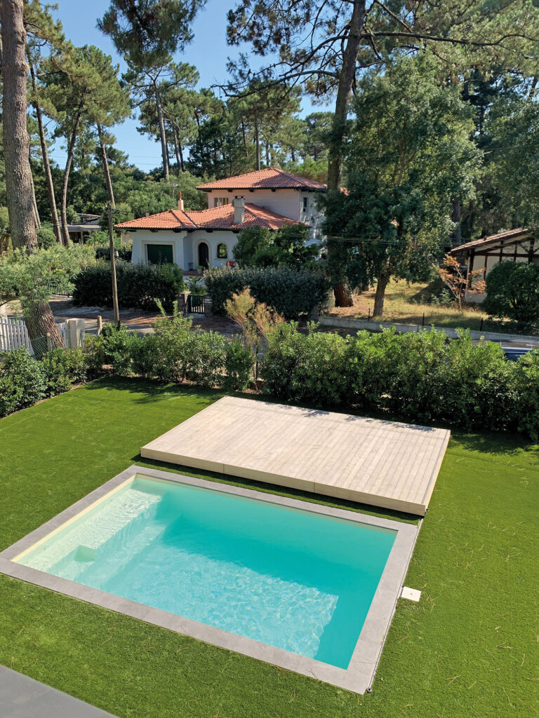 La terrasse mobile Diblue fonctionne comme un plancher coulissant sur le bassin, sécurisant la piscine tout en libérant l’espace lorsque celle-ci n’est pas utilisée.