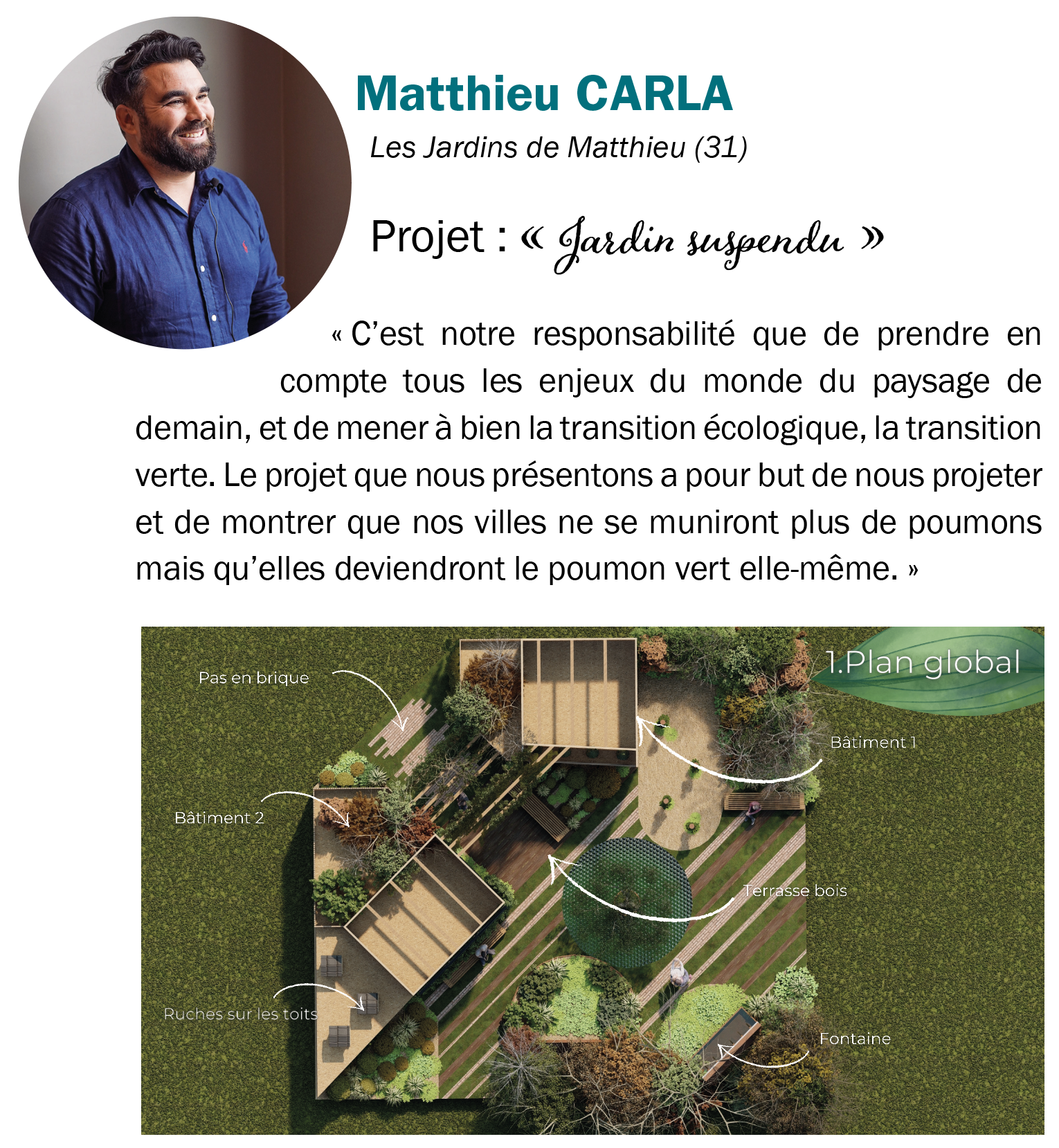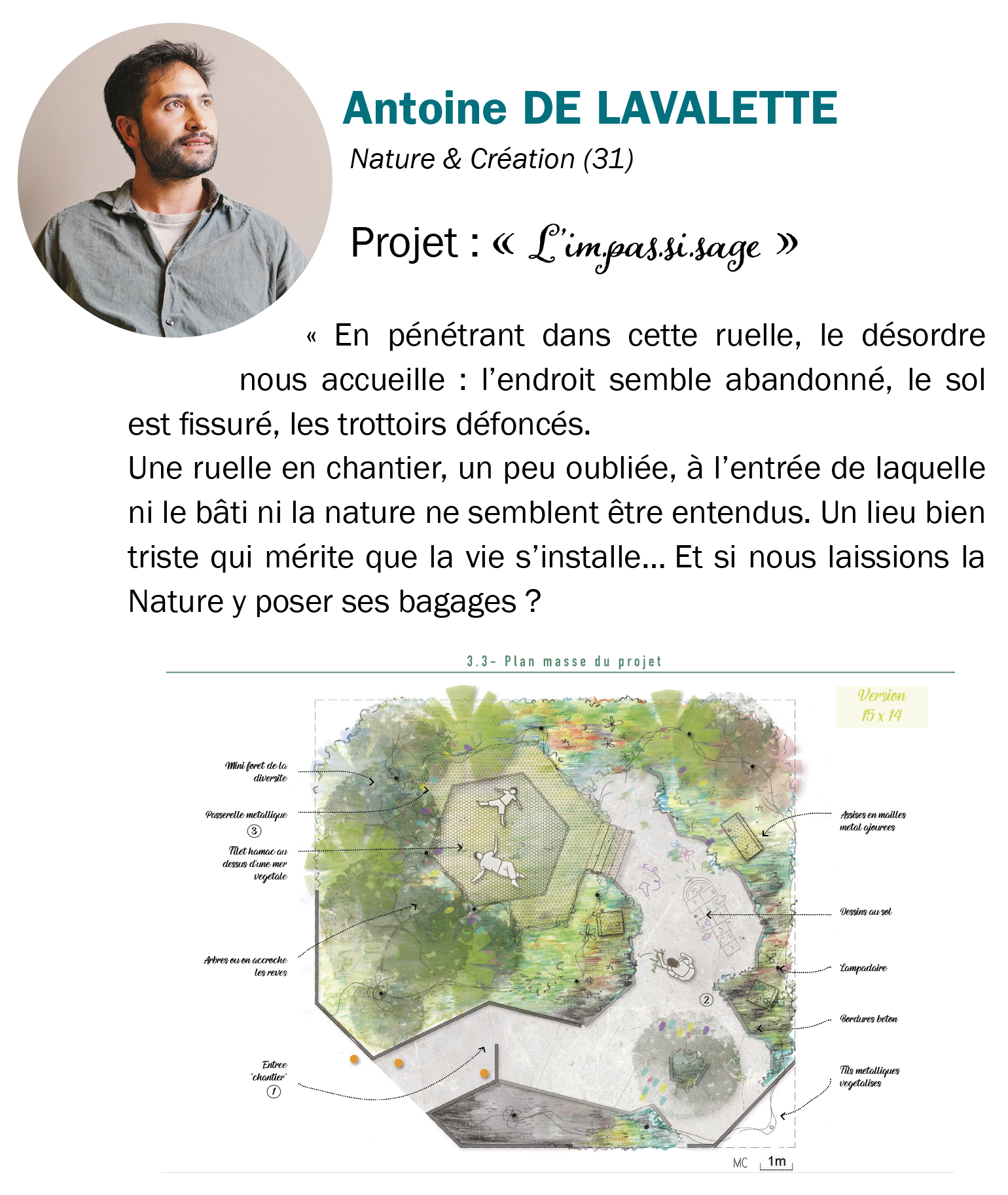 Aujourd’hui, un Français sur trois vit en zone urbaine. Dynamique, mouvante et bruyante, la vie en ville peut générer des sentiments de stress, de mal-être ou encore de solitude. C’est pourquoi la thématique retenue pour cette édition est celle de la « Biodiver’cité » : les 4 finalistes auront donc carte blanche pour révéler la manière dont l’aménagement paysager peut davantage participer à la re-formulation de la vie urbaine. Ils donneront ainsi à voir leur interprétation personnelle de la Biodiver’cité.