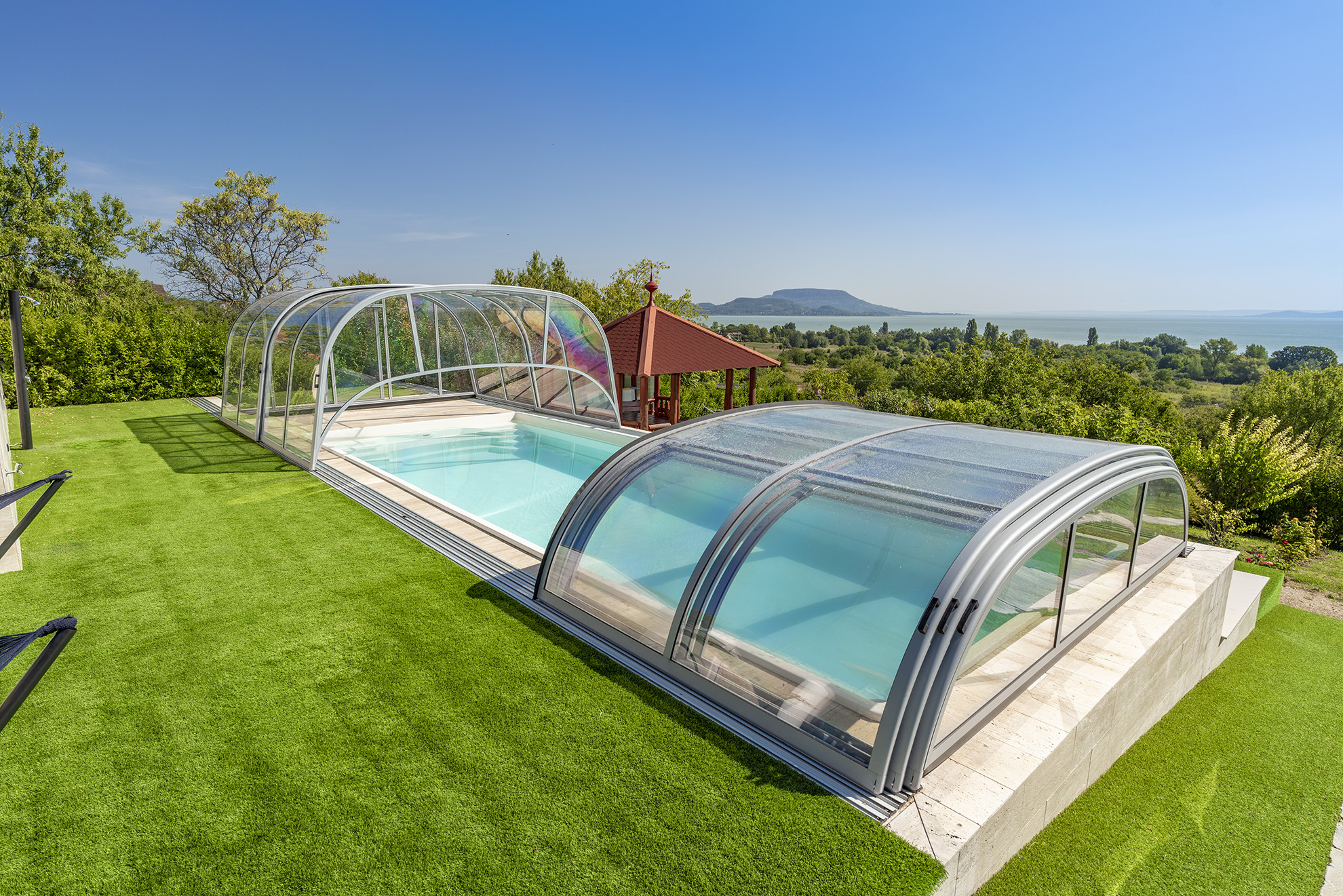 • Le modèle Hedone : un abri de spa aux parois verticales 100% transparentes. Equipé d’un toit est fixe, il dispose de portes coulissantes sur ses 4 côtés.