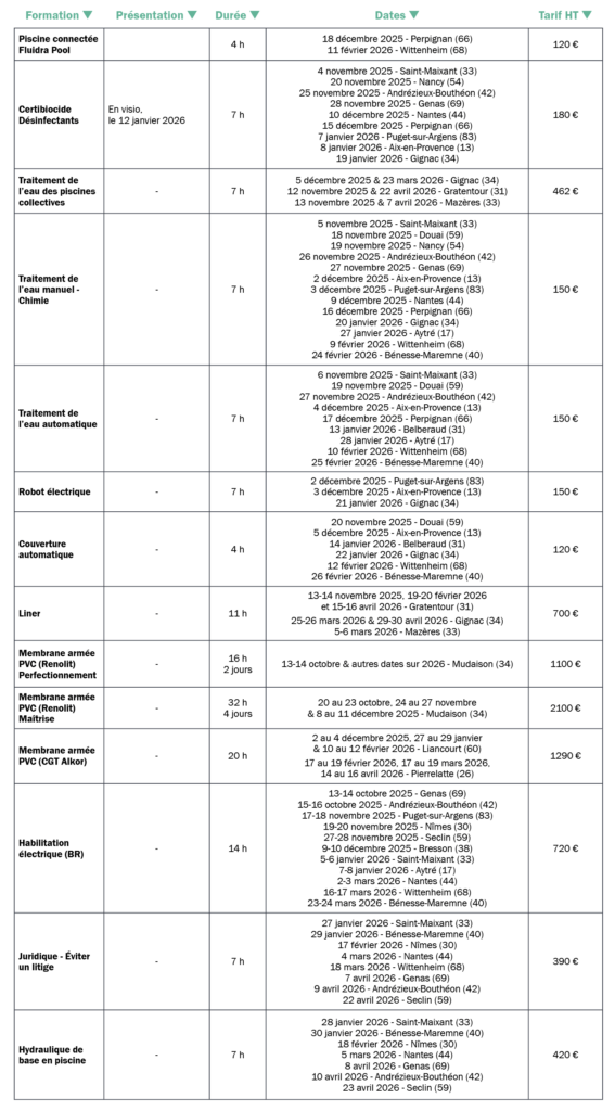Réservées aux clients Fluidra, ces sessions de formations se tiennent d’octobre 2025 à avril 2026. Les professionnels de la piscine se forment auprès d’experts produits sur 6 thématiques liées aux solutions AstralPool, Zodiac® & CTX® Pro : traitement de l’eau, robots de piscine, couvertures, liner. Fluidra est certifiée « organisme de formation QUALIOPI ».