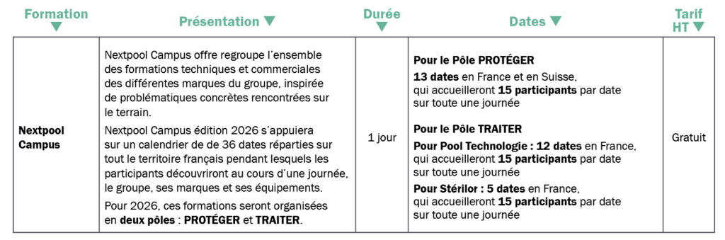 En 2026, Nextpool Campus propose 3 programmes de formation répartis en 2 pôles : TRAITER avec des journées dédiées aux appareils Pool Technologie et d’autres aux appareils Stérilor et PROTÉGER avec des journées consacrées aux gammes de produits Abriblue et Oré.