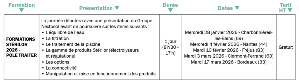En 2026, Nextpool Campus propose 3 programmes de formation répartis en 2 pôles : TRAITER avec des journées dédiées aux appareils Pool Technologie et d’autres au appareils Stérilor et PROTÉGER avec des journées consacrées aux gammes de produits Abriblue et Oré.