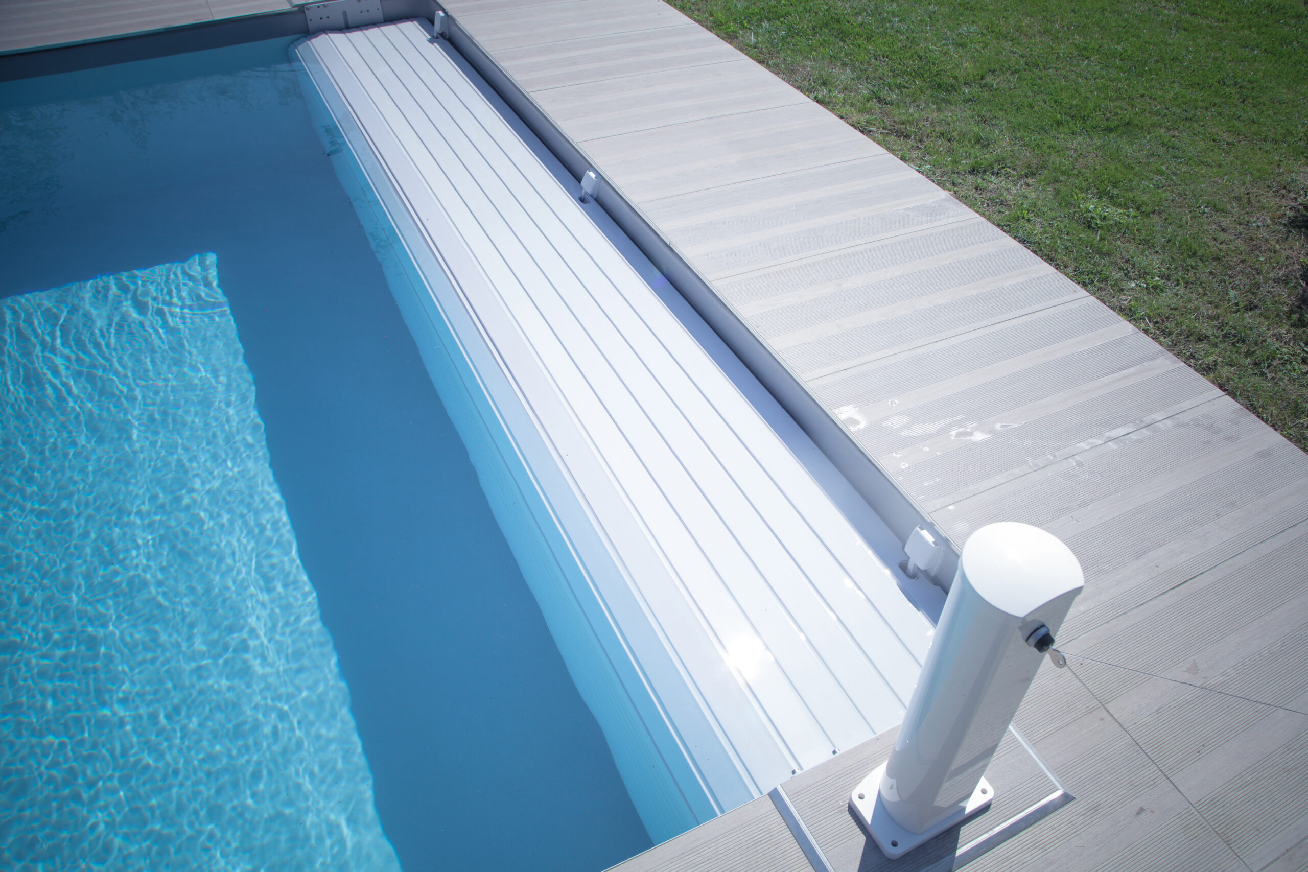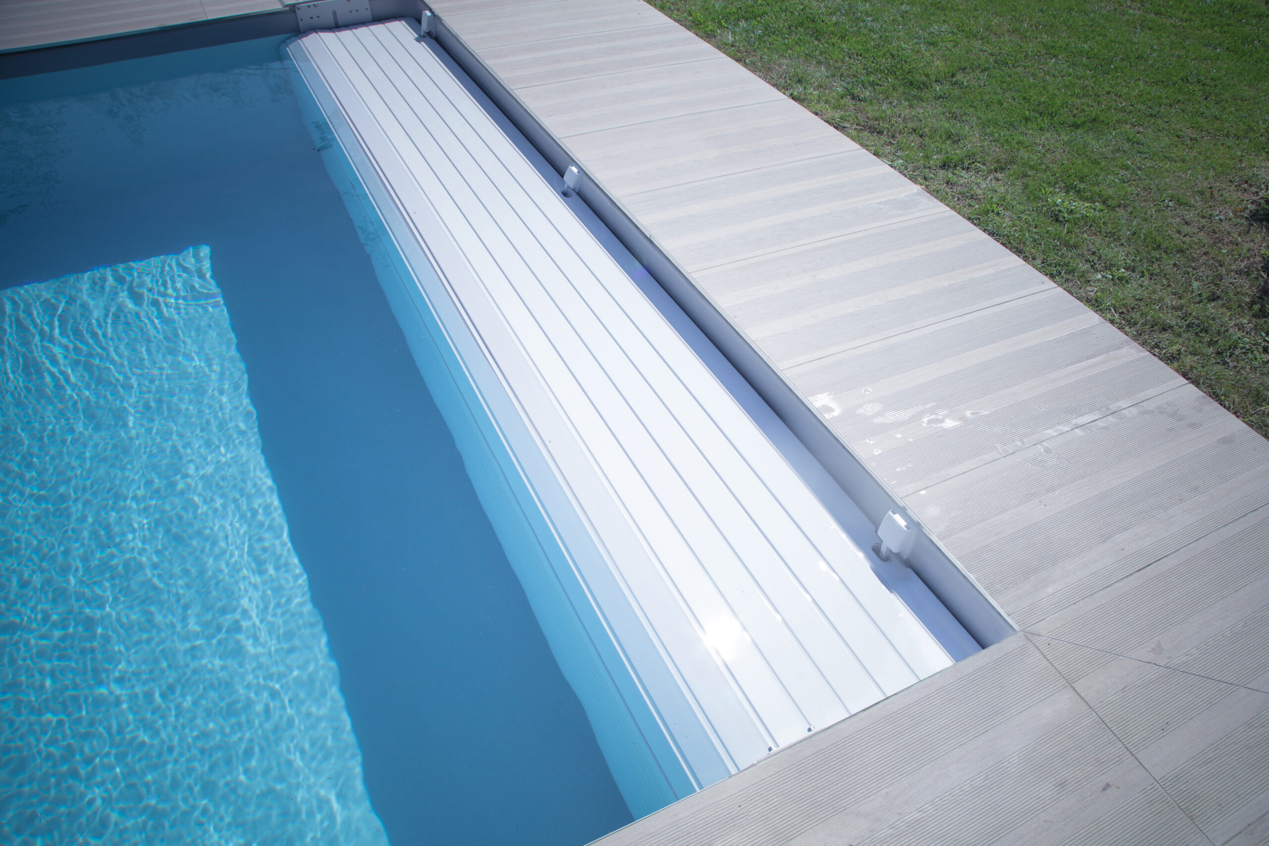 Plusieurs finitions de lames sont ainsi proposées par Abriblue pour améliorer les fonctionnalités de ses tabliers. La finition “ailette brosse”, limite le passage des impuretés dans le bassin et se fond dans le décor du tablier grâce aux 4 coloris proposés au choix (blanc, sable, gris clair et gris galet).