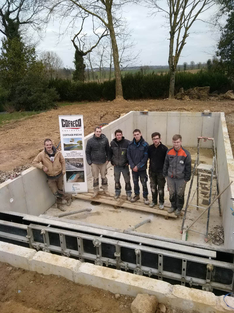Alain Morion, de la société Eden et Eau de Rennes, a déjà construit plusieurs dizaines de bassin en utilisant le système de coffrage récupérable et réutilisable Cofreco. Chaque année il propose aux élèves du centre de formation de Rennes (35) une formation durant un chantier. Cette formation s’est déroulée, cette année, du 11 au 14 mars, par séquences de quelques heures. Etaient présents, outre Alain Morio, Steven Autret, formateur du MFU – CFA, Gilles Cousson, responsable coffrage chez Cofreco ainsi que 9 élèves du centre de formation. Au programme de ces journées la réalisation d’une piscine 8 m x 3 m avec volet roulant et pièces à sceller blanches intégrées avant coulage du béton. Les élèves ont pu ainsi découvrir toutes les possibilités offerte par le procédé : montage, mise en place des aciers, des pièces pvc intégrées au béton (talonnettes, espaceurs étanche), intégration des skimmers, de la prise balai, des refoulements, ainsi que les opérations du coulage du béton et du décoffrage. Une formation 100 % béton que les élèves ont tout particulièrement apprécié.