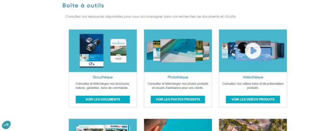 La Boîte à outils centralise l’ensemble des ressources indispensables aux pisciniers : documents techniques et commerciaux, photos produits, tutoriels vidéo, catalogues et fiches produits, ainsi qu’un accès aux outils métier comme LivePool PRO pour l’analyse de l’eau et la gestion du parc client. L’espace a été conçu pour rendre la navigation intuitive, sécuriser l’accès à l’information et garantir une utilisation fluide en toutes circonstances.