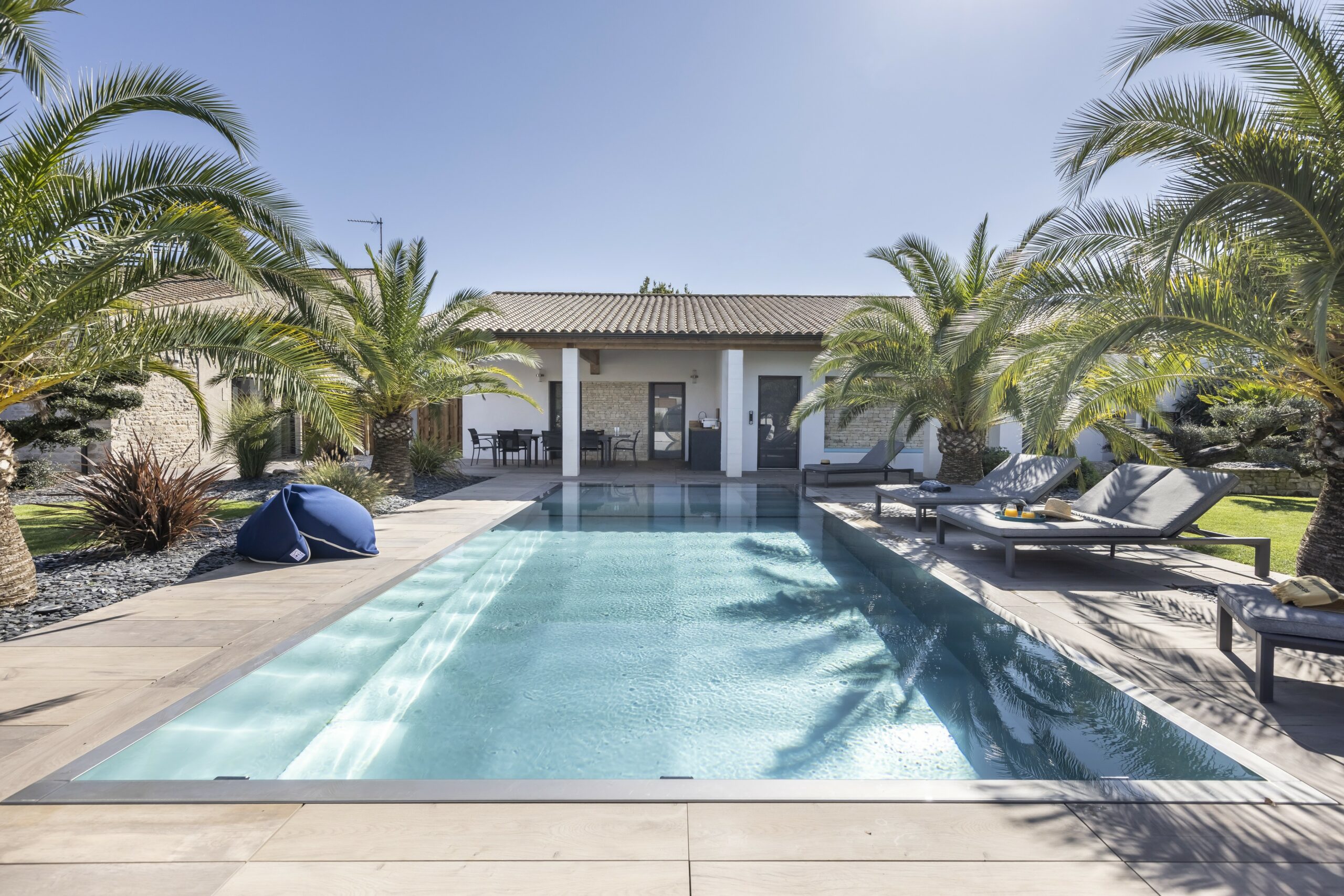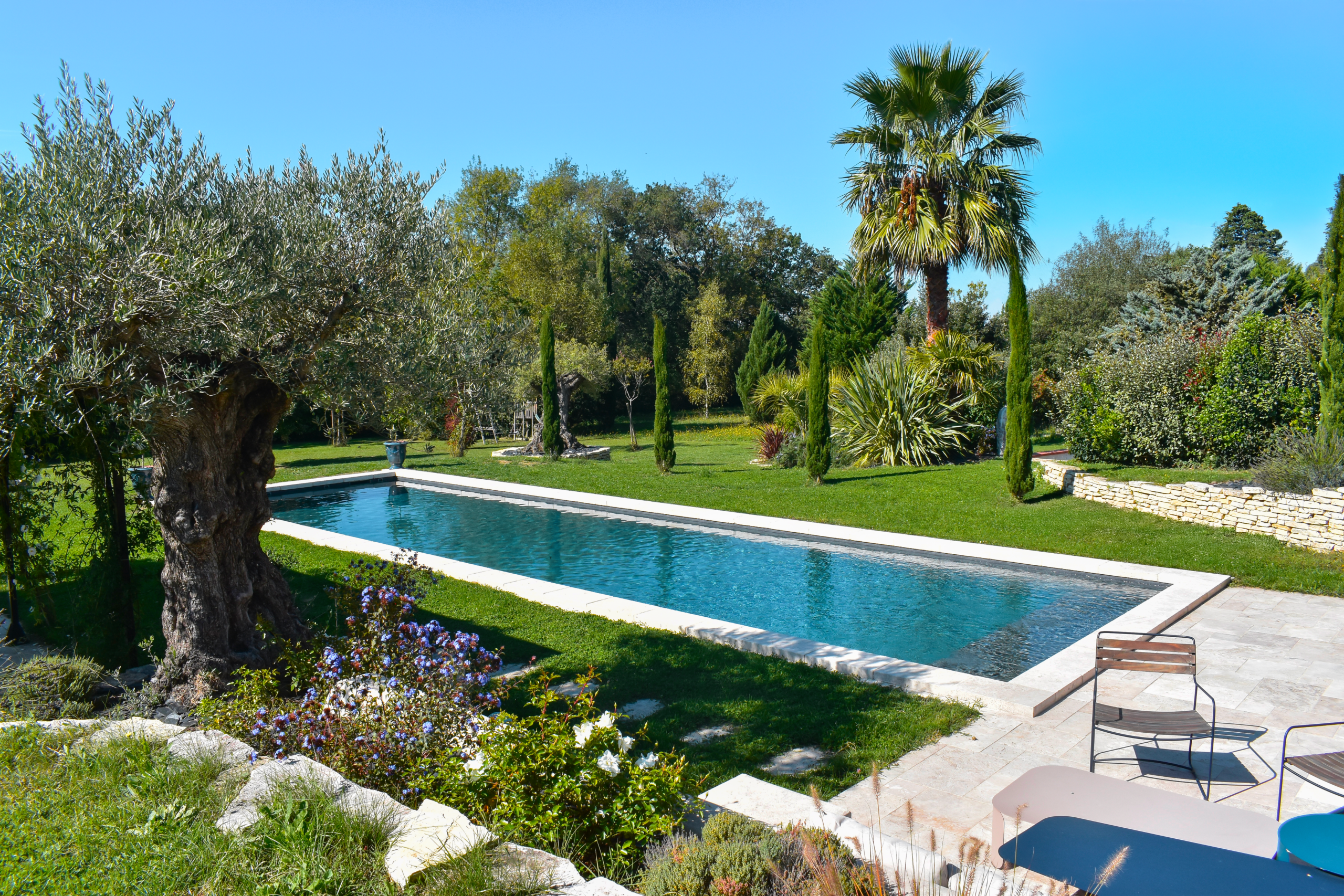 Grande piscine familiale de forme libre.