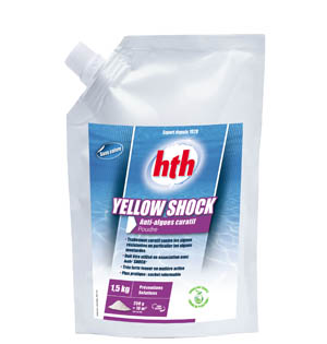 Afin de les traiter, hth lance hth® Yellow Shock. Il s’agit d’un traitement curatif contre les algues résistantes et en particulier les algues moutarde. Yellow Shock s’utilise en association avec un traitement choc à base d’hypochlorite de calcium à effectuer dans l’heure qui suit le traitement. Dosage : 1 kg de produit pour 40 m3 d’eau.