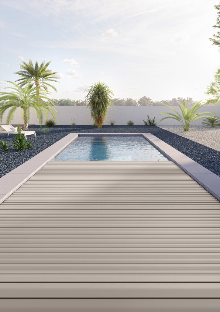 Sofatec lance des lames plates premium bicolores (Gris & Gris clair, Blanc & Sable) conçues pour offrir une finition haut de gamme et parfaitement intégrée à l’environnement du bassin.