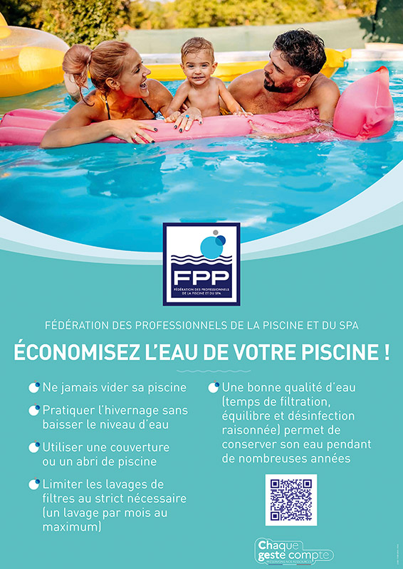 Il est essentiel de communiquer sur la réalité de l’utilisation de l’eau afin que le secteur ne subisse pas des impacts économiques trop importants. Pour cela, la FPP a mis en place des actions concrètes et a créé des supports pour entériner l’engagement des professionnels et pour guider les particuliers propriétaires de piscine vers une utilisation plus sobre de la ressource en eau.